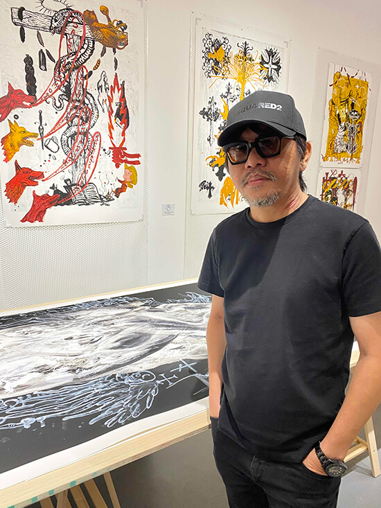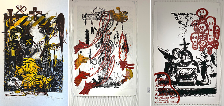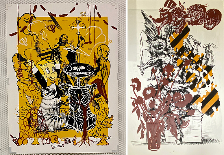 At Cloud Grey, the two artists walk us through the work area—a table slab set atop wooden sawhorses. It’s something gallery director Ruel Caasi has been doing lately, using Cloud Grey as a launchpad for collabs, including a BenCab x Ventura show several years back. For “Ronald Ventura x Manuel Ocampo: Dialogo,” the artists started with a fairly neutral zone: a black and white digital print, from either artist, as background to work over. They then limited their color palettes to acrylic reds and yellows (you can tell who’s who) in the final layered work.