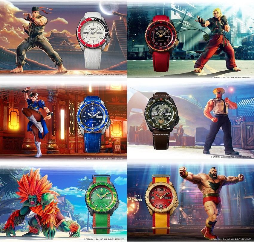 The Seiko 5 Sports collection features six models inspired by the game‘s most iconic characters throughout the series: Ryu, Ken, Chun-Li, Guile, Zangief and Blanka.