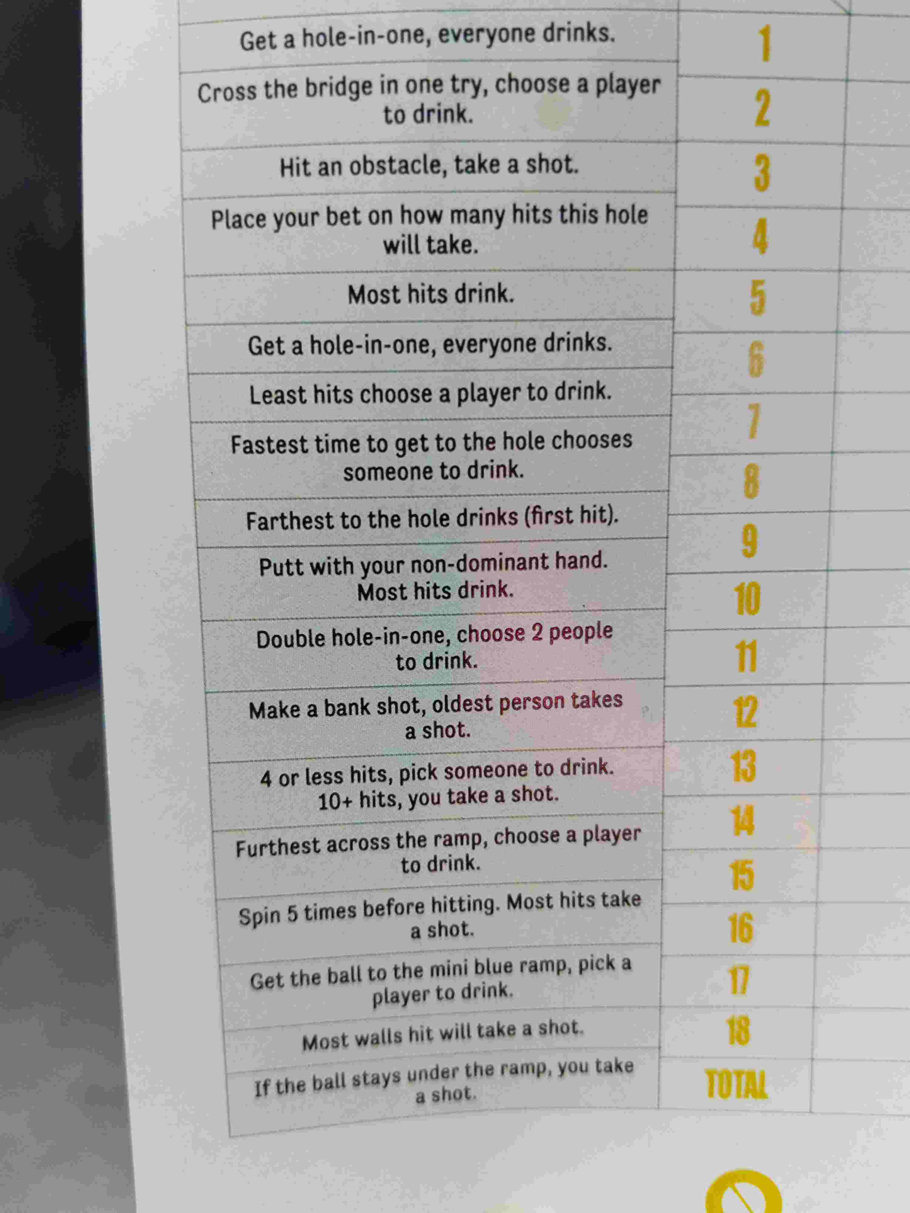 To add some spice to the game, Quantum Mini’s scorecard also has a “Swing & Sip” twist where players must take a drink if they ever complete an objective.