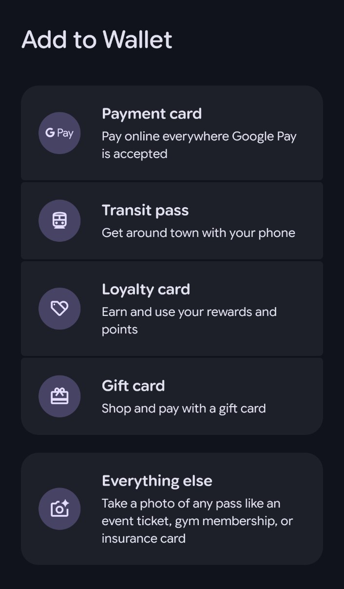Click the "+" sign at the bottom to add your payment card details to your wallet. You can also add public transport cards, loyalty cards, and gift cards.