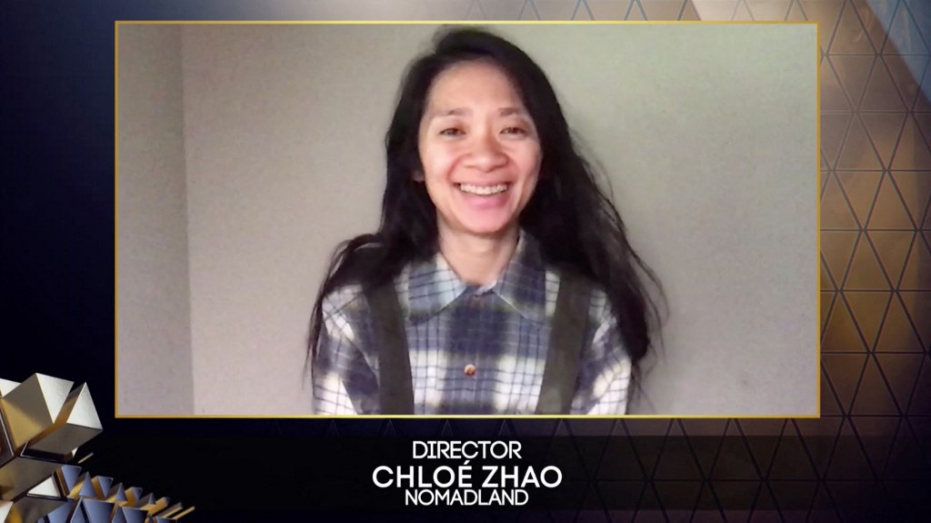 Zhao accepted Nomadland’s multiple awards dressed casually in a plaid shirt from Los Angeles, saying that she planned to start the day with celebrations.