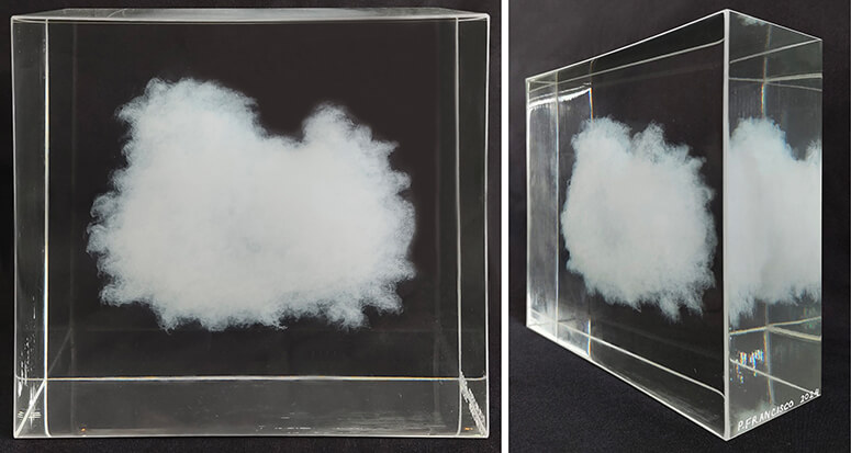 These encased resin boxes—these new worlds in small, confined spaces—are the epitome of Fransico’s way of looking at reality: layer over layer, one event after another, built up from unexpected moments until they crystallize.