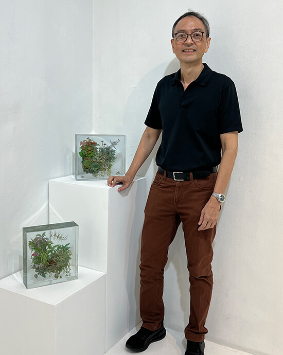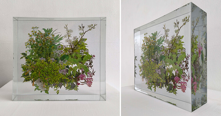 Using his enduring theme of flora and nature, Francisco employs a variety of used books and prints to give new life to soon-to-be-discarded media. His new resin-encased worlds offer a resuscitation—like preserved and terraformed gardens.