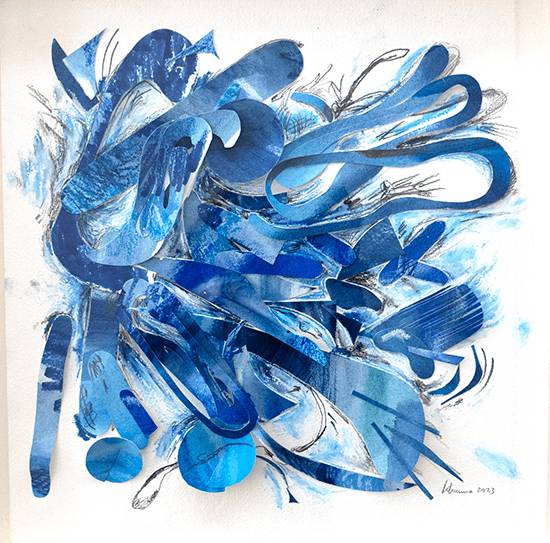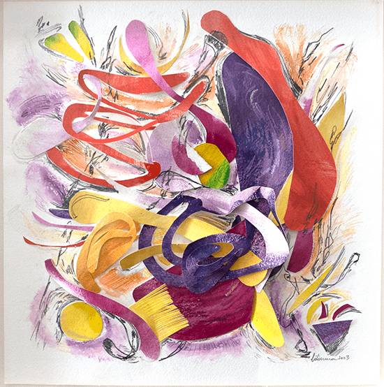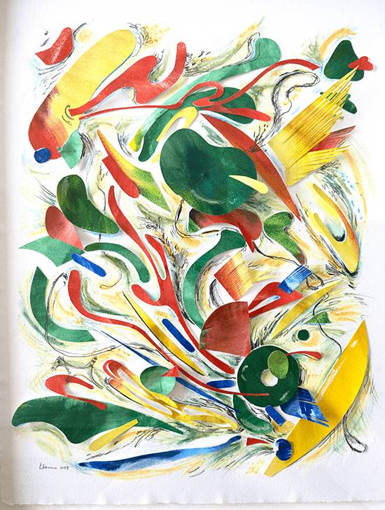 For her wall-mounted works, she turned to manipulating paper, which she found to “reflect the malleability of human emotions, which can bend any which way in a given moment.” She draws on it and colors it with oil pastel, acrylic and pencil while cutting out forms that she superimposes on the surface — carefully placing and orienting them to achieve an overall rhythm that characterizes each piece. “I am drawn more to 3D forms, paper, pencils and building things. When I decided to make my own characters/language for this collection, I saw them as differently shaped paintbrushes that I could use and put together to layer and grow on the paper to tell a story and show a feeling.”