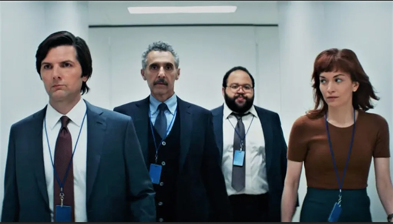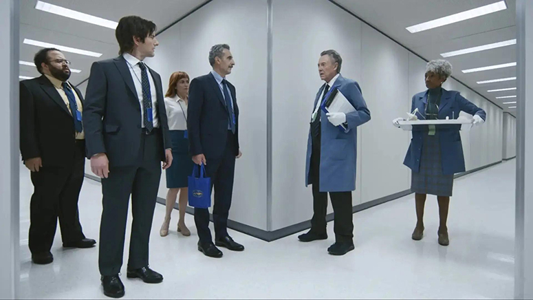 Mark oversees the arrival of a new employee, Helly (Britt Lower), who wakes up post-surgery lying on a conference table and asks groggily, “Am I livestock?” Seen too many horror movies, we can’t help thinking. Entering the Lumon workforce is destabilizing, like being “severed” from the womb, then being asked your name, and what you remember from your past. Helly’s first instinct is to flee, but she soon learns this is impossible. Instead, like her new co-workers Mark, Irv (John Turturro) and Dylan (Zach Cherry), she learns to accommodate herself to the work at hand: a daily series of computer-based number-sorting tasks that they — and we — understand little about.