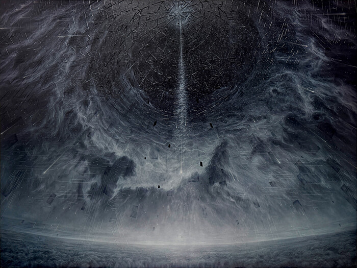 Working within a restrained monochrome tempered by bluish inflections, Bunag summons a visual language of sacred geometries, portals, structural repetitions, and quiet intimations of the void. The scale of the canvases amplifies this encounter, drawing the body into a direct confrontation with form and absence, surface and depth. These are not images to be glanced at but fields to be entered—if only imaginatively —through the artist’s unwavering and exacting vision.