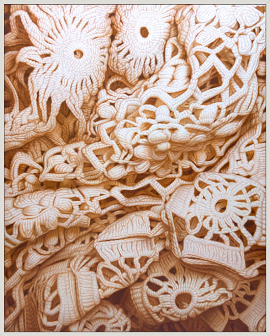 All the works in the exhibition return to a single motif: the interlocking threads of embroidery. The subject is immediately recognizable to those who grew up alongside older generations of women who passed the hours stitching—an activity at once domestic, meditative, and quietly sustaining. In revisiting this familiar object, Andrade reframes it as a site of memory and continuity, where repetition becomes a form of care.