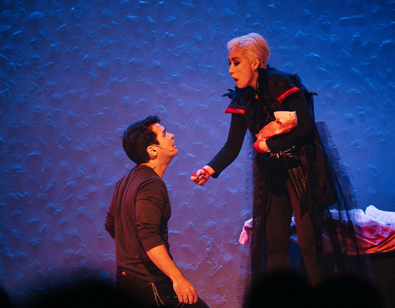 So they stitched together a story based on Wolfgang’s songs. “Basti let me go first, I made the initial plot,” says Gomez of the collaboration after the curtain closes at Doreen Black Box Theater, Areté, Ateneo University. “We had to agree which Faust to do, so we decided on the Goethe version—it’s been turned into an opera before, done in so many versions. But the one that came closest to our spines was the F.W. Murnau Faust,” a silent expressionist film. You can see it in the opera-like staging, the deep black eyeliner and somewhat overwrought gestures. There’s also the lack of a libretto: just the lyrics threaded together tell the story. “That’s where the text comes out, the after-effects. German expressionism was kind of our base.”