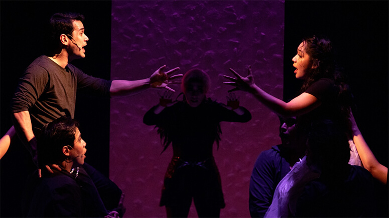 Then there’s the music. Along with the familiar chugging metal guitar riffs of Wolfgang songs, including some lesser-known ones that fit the story’s arc, there’s a Pearl Jam feel to the material as well: The ’90s grunge era spawned a lot of emo consciousness. The band’s melodic vocal lines play well over ballad guitar figures and the more operatic themes where the throats of all involved onstage get a serious shred workout. (Props to Sha-ira Opsimar as Marga, Joshua Cabiladas as Tino, and Matel Patayon as Martha for their chops.)