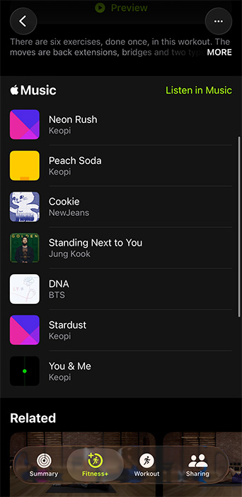 Each workout comes with a playlist via Apple Music to help you get hyped. For instance, the Core with Jenn workout on the platform features a K-pop playlist with tunes from Keopi, NewJeans, Jungkook, and BTS.