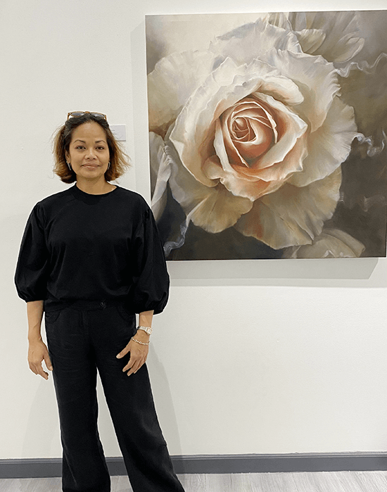 Arambulo-McAndrew studied graphic design at Parsons in LA and Paris, but before that, at UP, she “got discouraged, because they told me my work was ‘too Westernized.’” A friend said maybe she should paint Filipino flowers for this local show, “but I needed multilayered flowers,” so she chose roses, peonies, some bright and expansive, some faded with pale hues. “They had to be layered. They’re a bit more expressive; you can do more with shadows and dark, and light coming in.”