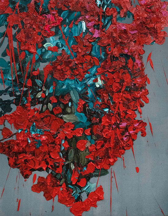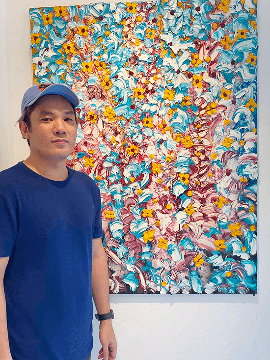 In “Quatervois,” Joseph Tecson’s flowers are built up from thick impasto slabs, reflecting bright, almost hyperreal colors. They’re drawn directly from a stay at his father’s flower farm in Tanay during lockdown, and they’re a far cry from the black-and-white violence-driven images he’s known for. But there’s still “angst” here, he says, even in the blossoms. There’s nothing tranquil about them.