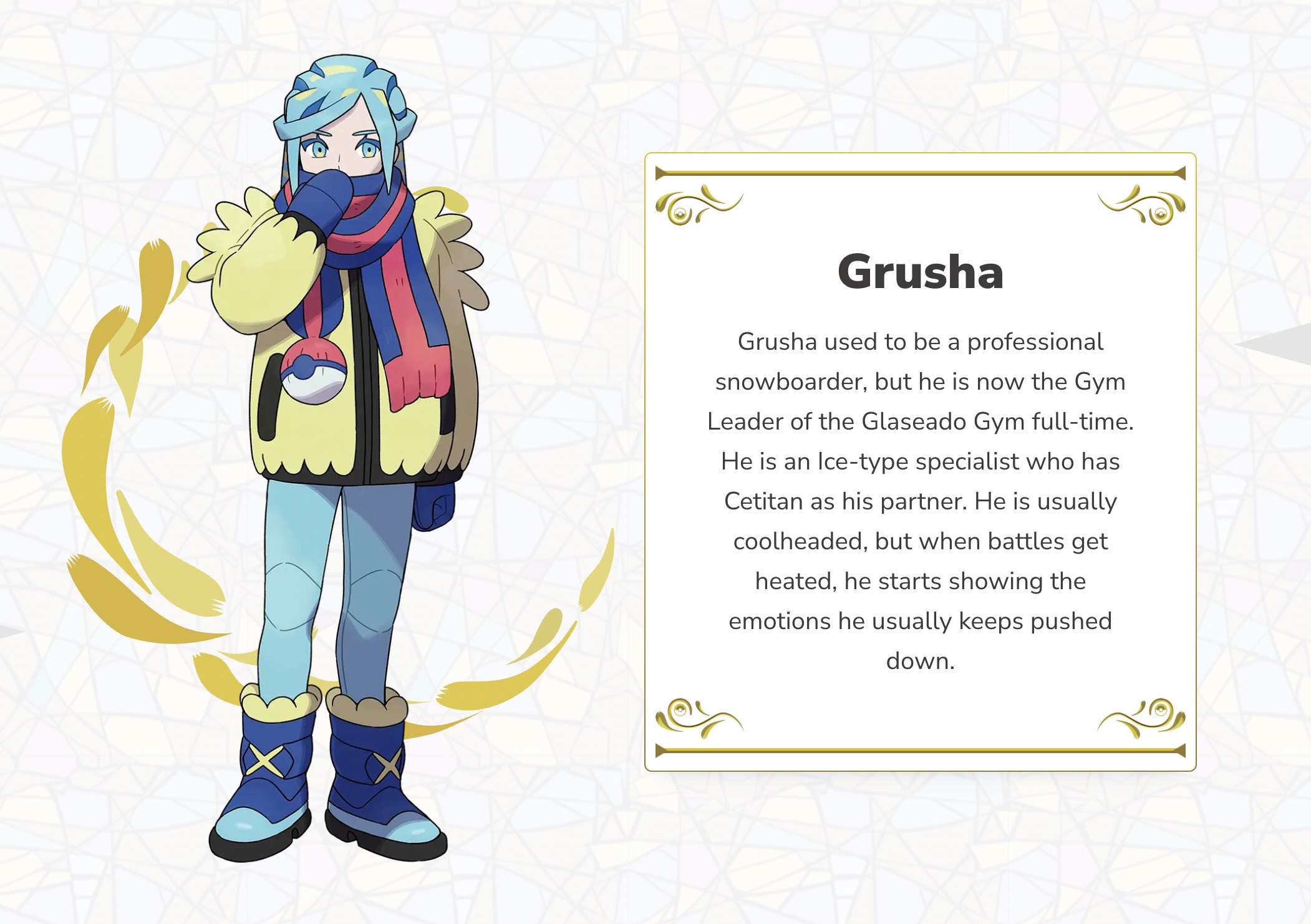Unlike previous games where the gym challenges are set in order, Pokémon Scarlet and Violet breaks that tradition and lets you have absolute freedom on which gym to take on first. One of the new gym leaders is Grusha, an ice-type specialist who "is usually coolheaded" but gets heated during battles and starts showing his emotions.