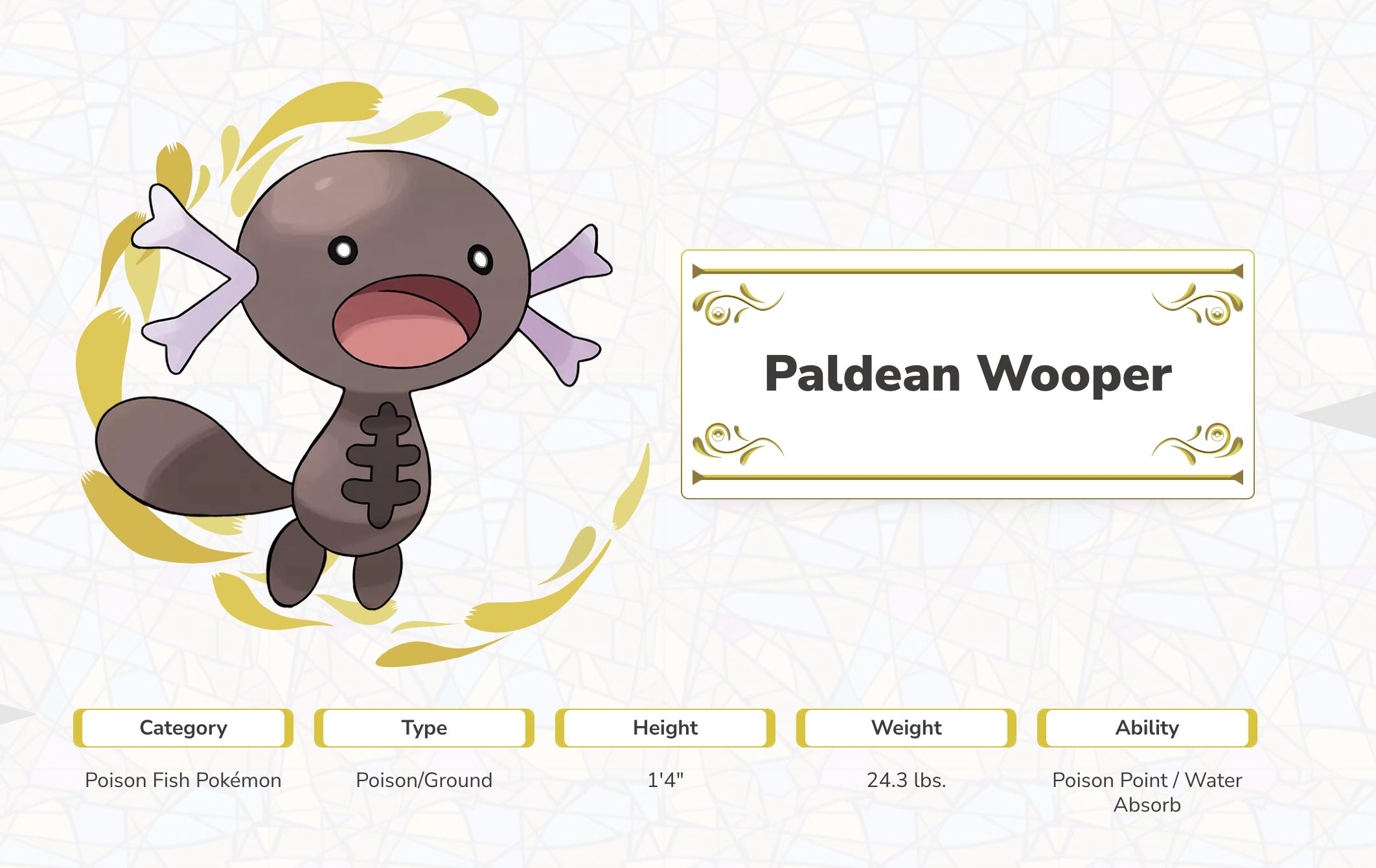 Adopting the regional forms first introduced in Pokémon Sun and Moon, the water/ground-type Pokémon Wooper has gotten its own regional design. This Wooper "lives on the land and covers its body with a poisonous film".