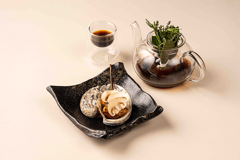 Next we sample the abalone with seaweed paste, served on a skewer, with a mushroom broth on the side—a journey through the land of umami. “It’s abalone interspersed with king oyster mushroom, then a broth made from eight different types of mushrooms, and clarified twice. So it’s basically a mushroom consommé.”