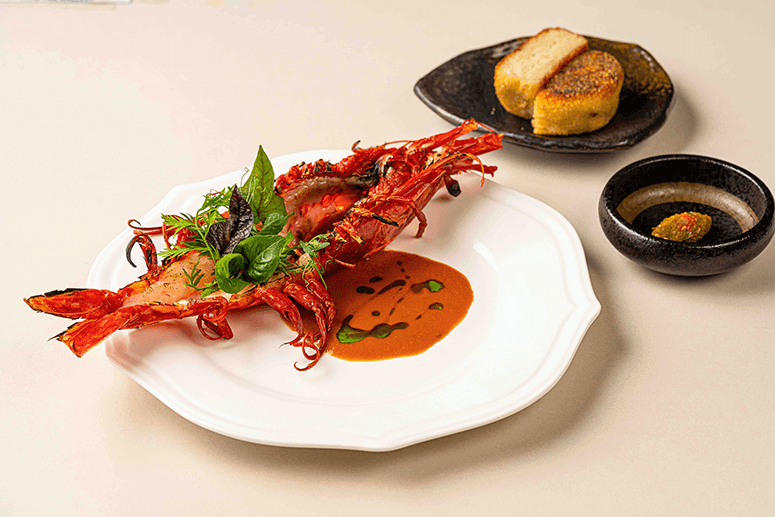 The Carabinero is a great example. As the penultimate dish, our table of 14 guests is blown away by the huge Spanish prawn, lightly grilled, served with a sauce made from the prawn heads (sustainability!), finished with spring onion oil, and served with a pillowy potato bread that is essential for dipping into the shell casing to get every morsel, and—instead of the jalapeño relish used at Lolla—a local sambal paste that adds a piquant kick to the dish.