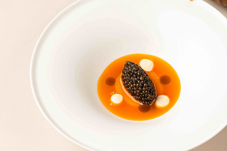 The Kaluga-hybrid caviar is piled on a cold serving of pumpkin, egg yolk sauce and crab and crème fraiche; next to it is a fried fish ball, you could say, with the leftover smoked sturgeon inside, as well as pickled wild garlic from France.