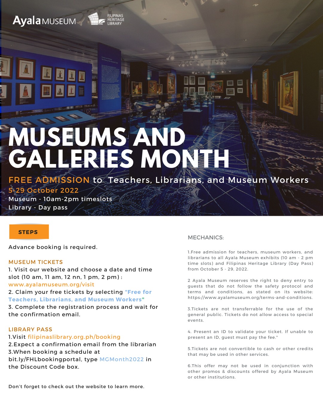 From October 5 to 29, teachers, librarians, and museum workers are entitled to free admission to Ayala Museum and the Filipinas Heritage Library.