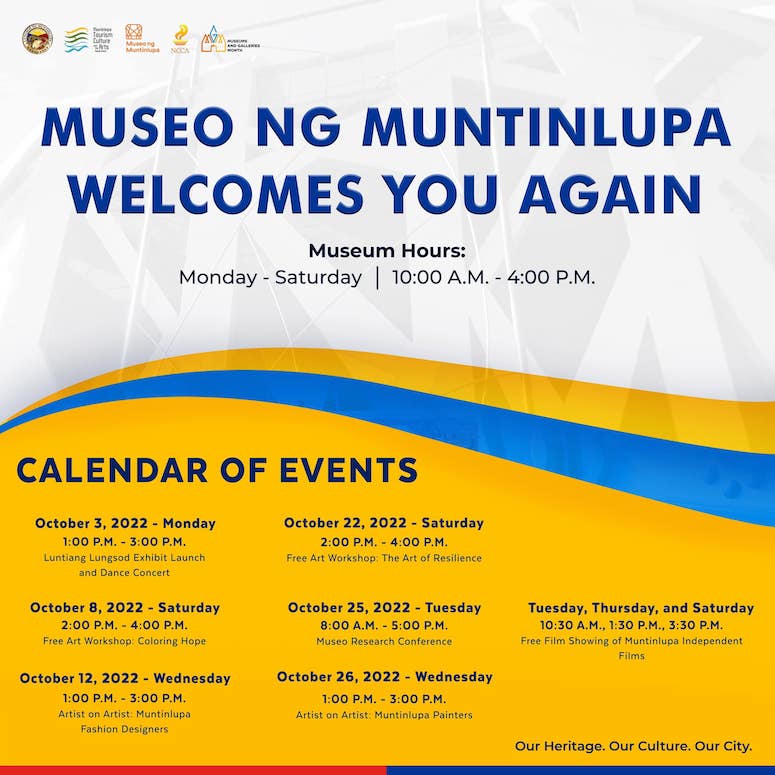 On October 3, Museo ng Muntinlupa finally re-opened its doors to welcome visitors from 10 AM to 4 PM. The museum will be open to the public from Monday to Saturday. Museo ng Muntinlupa is rolling out exciting activities for the month of October, including a free art workshop, free film showing, conferences, and many more.