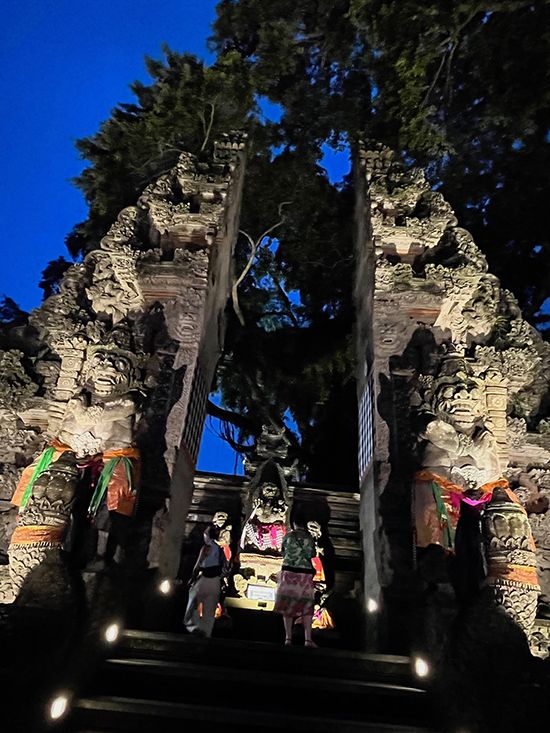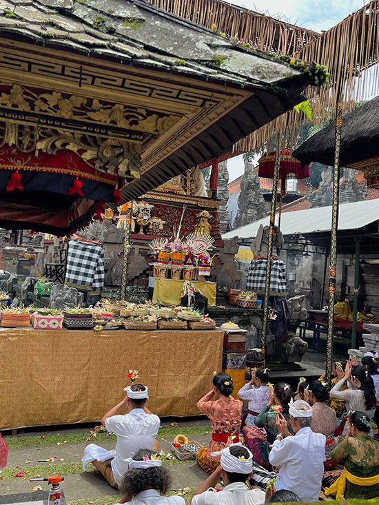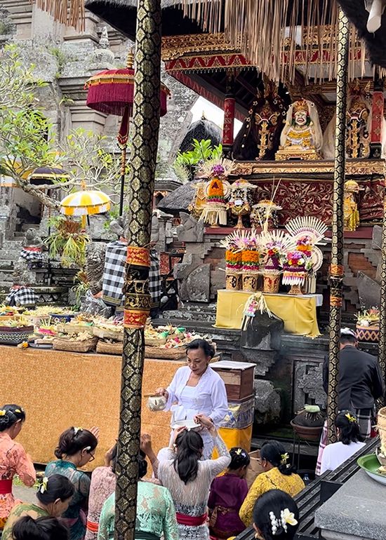 On the last day of Galungan, called Kuningan, when ancestors and the gods will return to their realm, culminating rituals reach a peak spiritual level, which we witnessed at the Pura Desa temple in Ubud, where the altars blossomed with decorations as priests and devotees presented their offerings with prayers of thanksgiving.