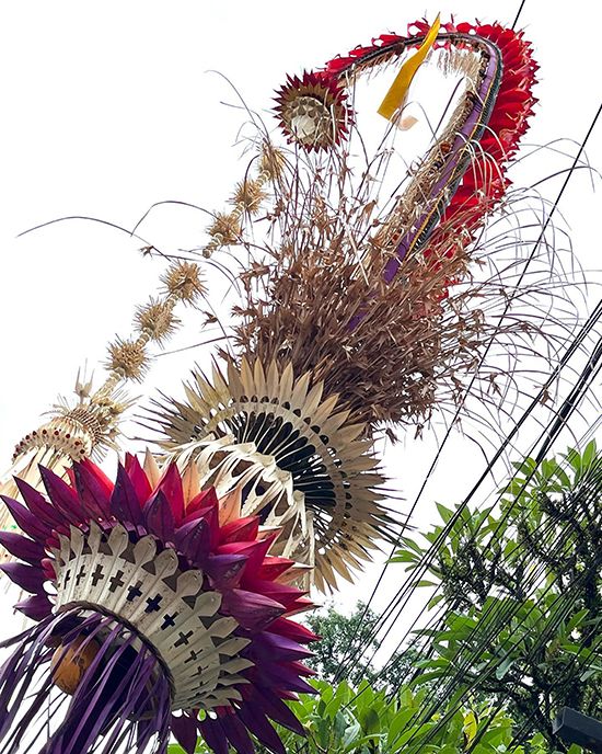 The streets are filled with beautiful penjors—curved bamboo poles that go up to 10 meters, crafted by families and communities who work on them together, using coconut leaves, fruits and flowers. What we thought were just décor are actually of profound religious significance, with the curved shape representing a sacred mountain and the midsection Sanggah Cucuk housing offerings to bring prosperity and safety.