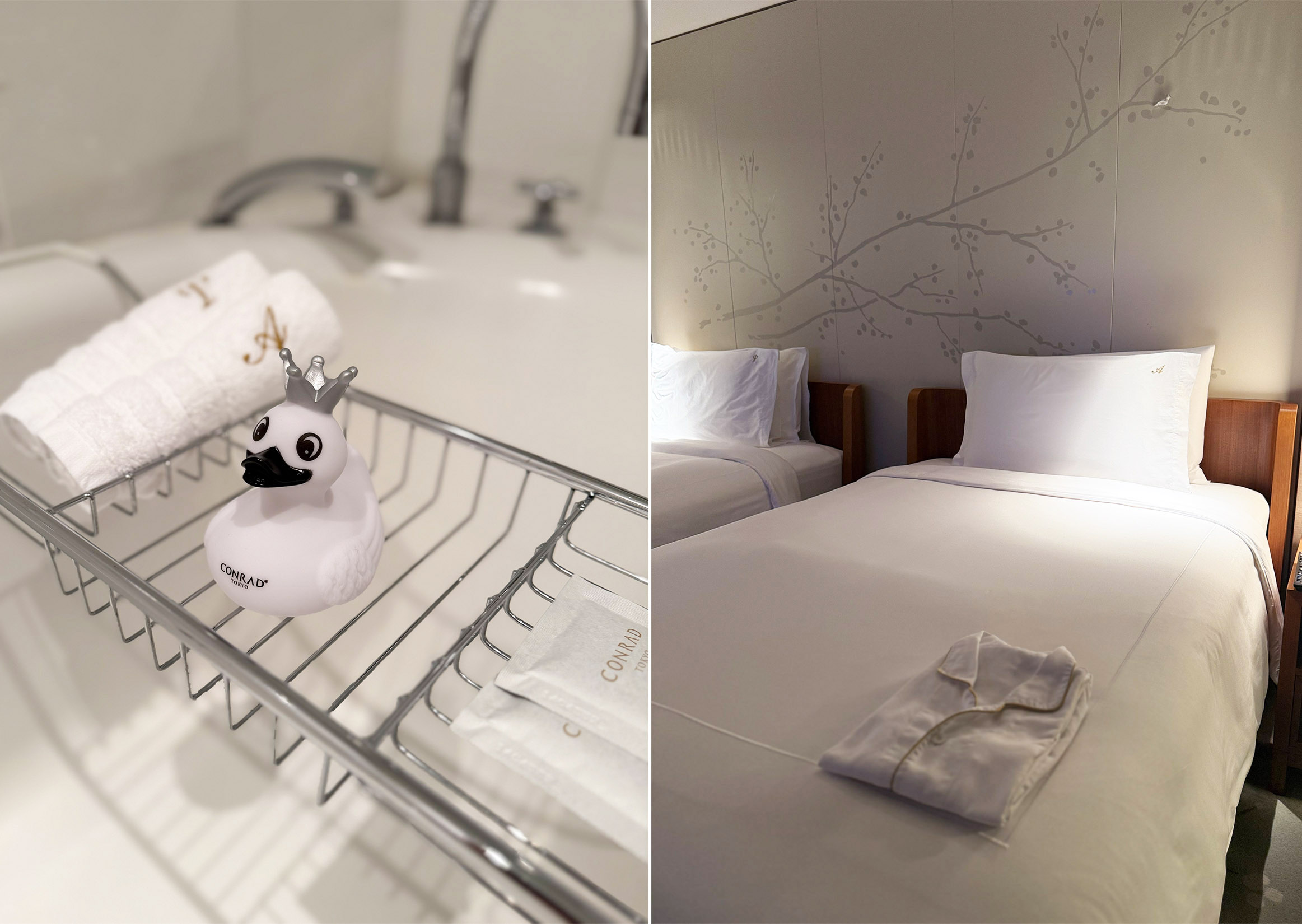 In their commitment to exceptional service, Conrad Tokyo also ensures a stay filled with delightful, personalized touches right in your room. Guests are treated to comfort items like personalized pajamas and pillow cases, making the space uniquely their own. The bathroom also features their signature rubber duckies, adding a whimsical touch to the luxurious experience.