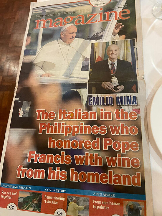 The Filipinos’ love of music is one of the reasons why Emilio is fascinated with the Philippines. “And of course, the people are so kind. And religious,” adds Emilio who was sending wine to Pope Francis for over 10 years, out of devotion and admiration. He sent bottles of Barbera d’Alba which was made in Piedmont, famous for its wines and truffles. “The Pope’s paternal roots are traced in Piedmont,” Emilio explains. His gifts of wine bottles were acknowledged with thank-you notes from the Pope by cardinals from the Secretary of State.