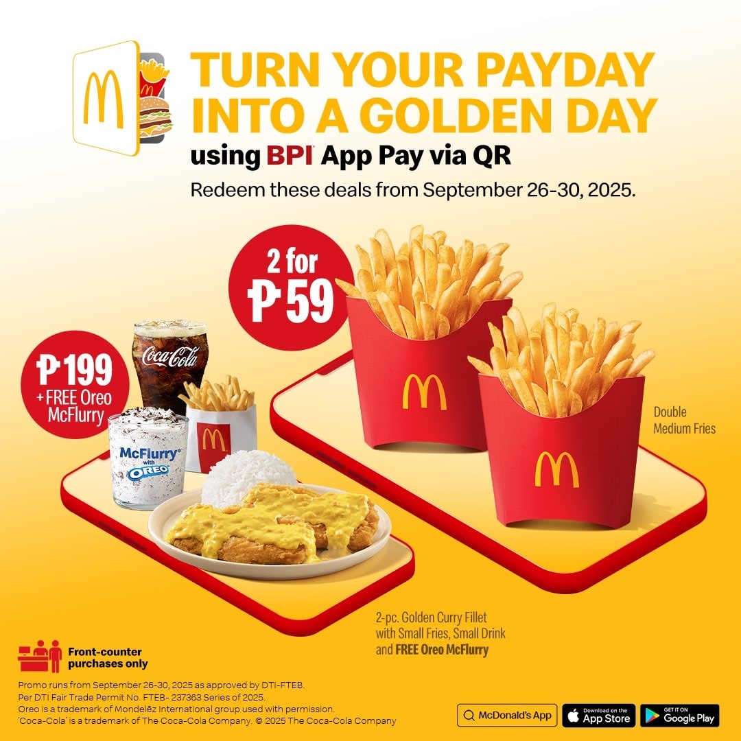 Here's a payday deal you wouldn't want to miss: Until today, Sept. 30, you can score two McDonald's medium fries for only P59, letting you save as much as P115.