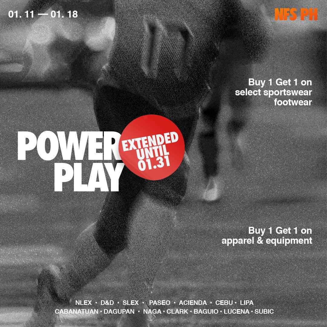 Nike Factory Store's ongoing Power Play sale has been extended until Jan. 31, where you can enjoy a Buy 1 Get 1 promo on select sportswear and footwear.