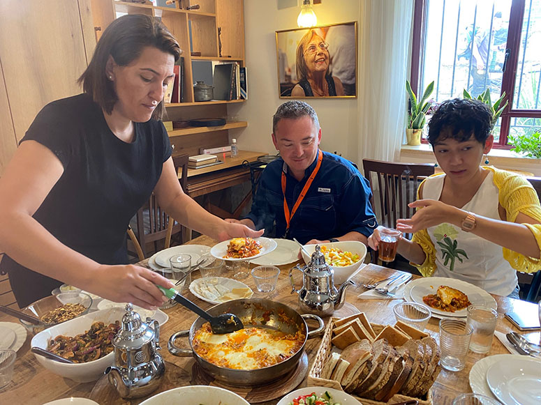 I first had it in a little hotel in downtown Tel Aviv, where breakfast was served in the cramped lobby with three little tables-for-two. I’m not that adventurous an eater so I approached this with caution, but was quickly won over; it wasn’t too exotically spicy, perhaps toned down for touristy tastes. With bread to sop up the sauce, it was a very hearty meal that sustained me till dinner.