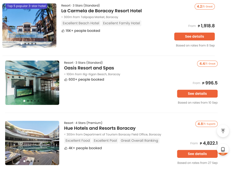 Some of the most budget-friendly deals in Boracay include Oasis Resort and Spas for P996.50 and Lola’s Lodge for just P926.30. Stays at the top rated La Carmela de Boracay Resort Hotel are just P1918.80 based on rates from September 8, 2022.