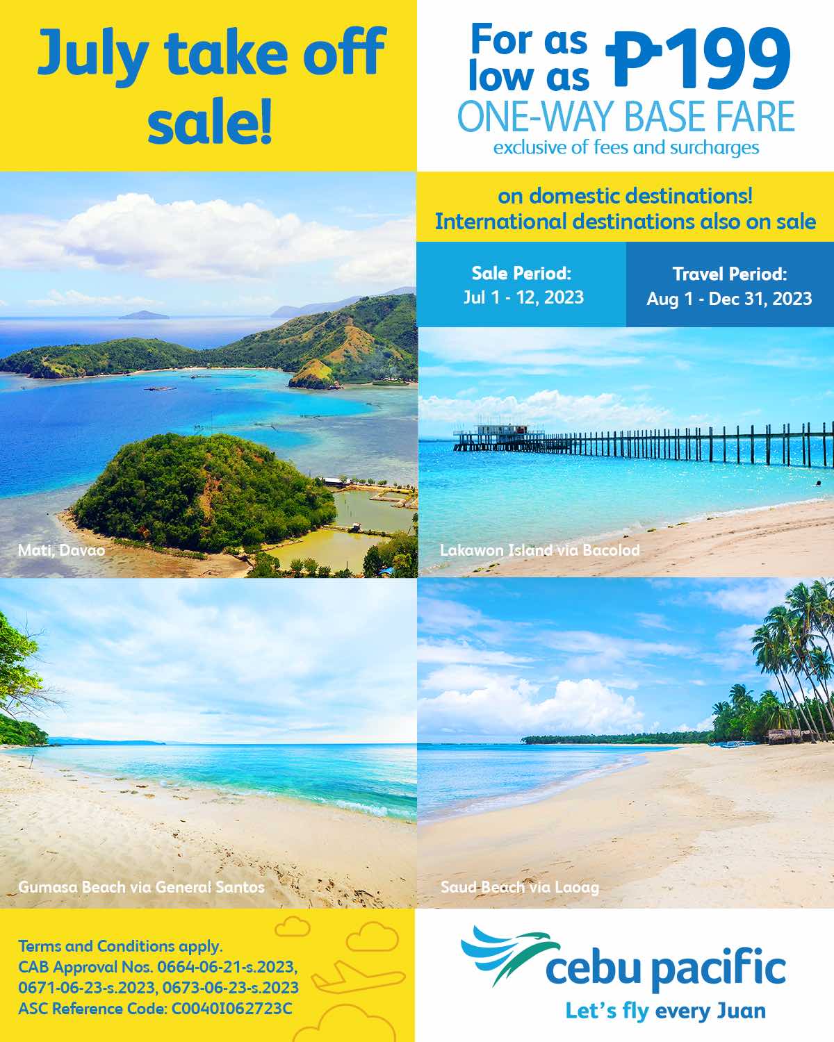 If you missed Cebu Pacific’s P88 promo this month, you’d be happy to know that the airline company has an ongoing July take-off sale until July 12—with one-way base fares for as low as P199.