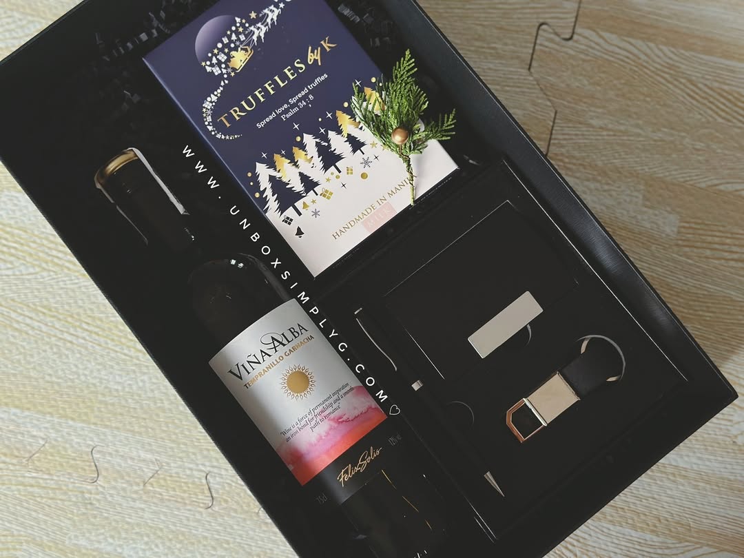 For instance, the holiday special curated wine and truffle gift set (P2,999) from SimplyG Gift Shop can serve as a treat as a treat. The box includes chocolate truffles, wine, a card holder, a pen, and a key holder.