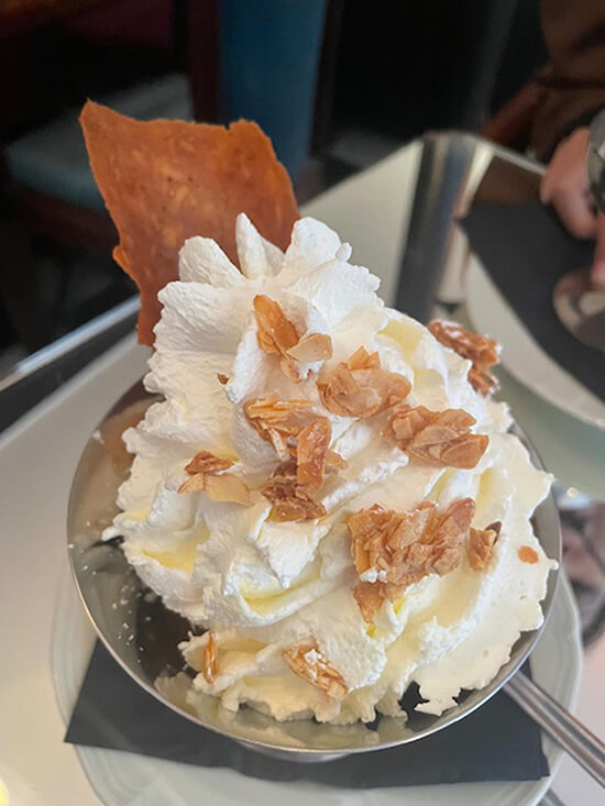 As for ice cream, you must saunter over to the Ile Saint-Louis where, near the Notre Dame, Berthillon has been serving up their famous ice cream at 34 Rue Saint-Louis, since 1954. If you’re fortunate enough to be there in the fall, that’s the season for pears and they will serve poire Belle Helen, a rich coupe of vanilla ice cream, fresh pears, chocolate sauce and a mountain of Chantilly cream. Luscious French ice cream is custard-based, when you compare it to cream-based American ice cream.