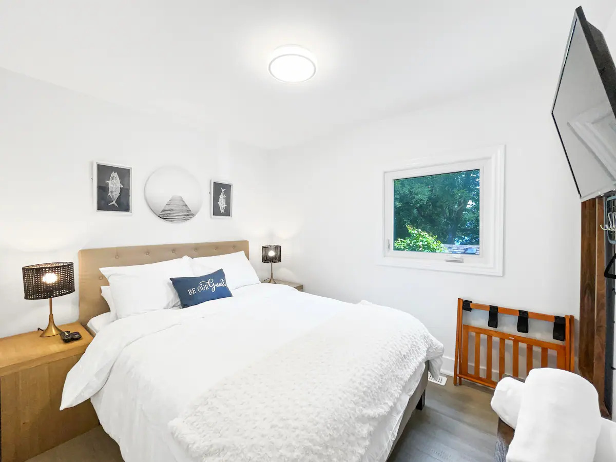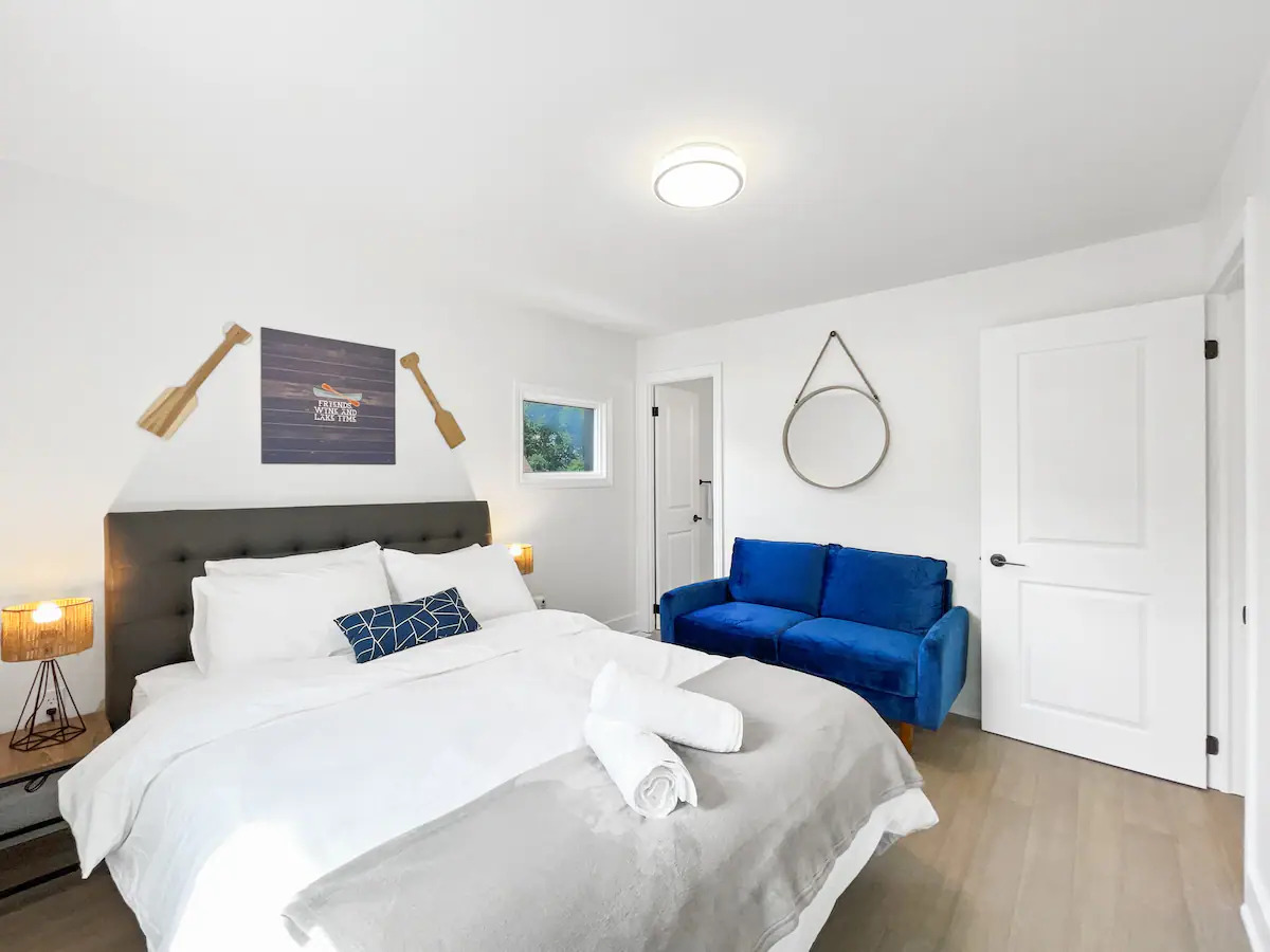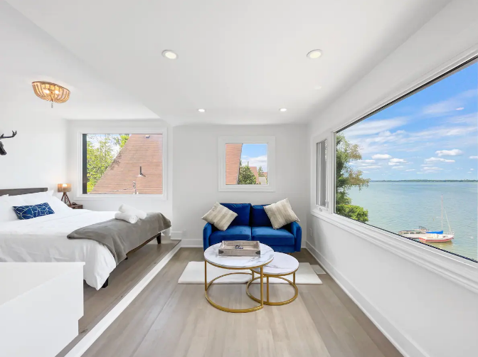 The lakehouse has four bedrooms, including a master bedroom with a queen bed for two. It's the perfect relaxation haven as the room offers stunning lake views from the sitting area and wrap-around windows.