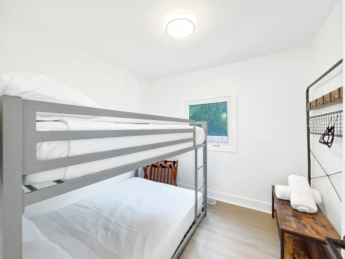 The second bedroom has a queen-sized bed, an ensuite bathroom with shower, and a Smart TV. The third bedroom also has a bed of the same size, while the fourth one has two double bunk beds that can accommodate up to four guests.