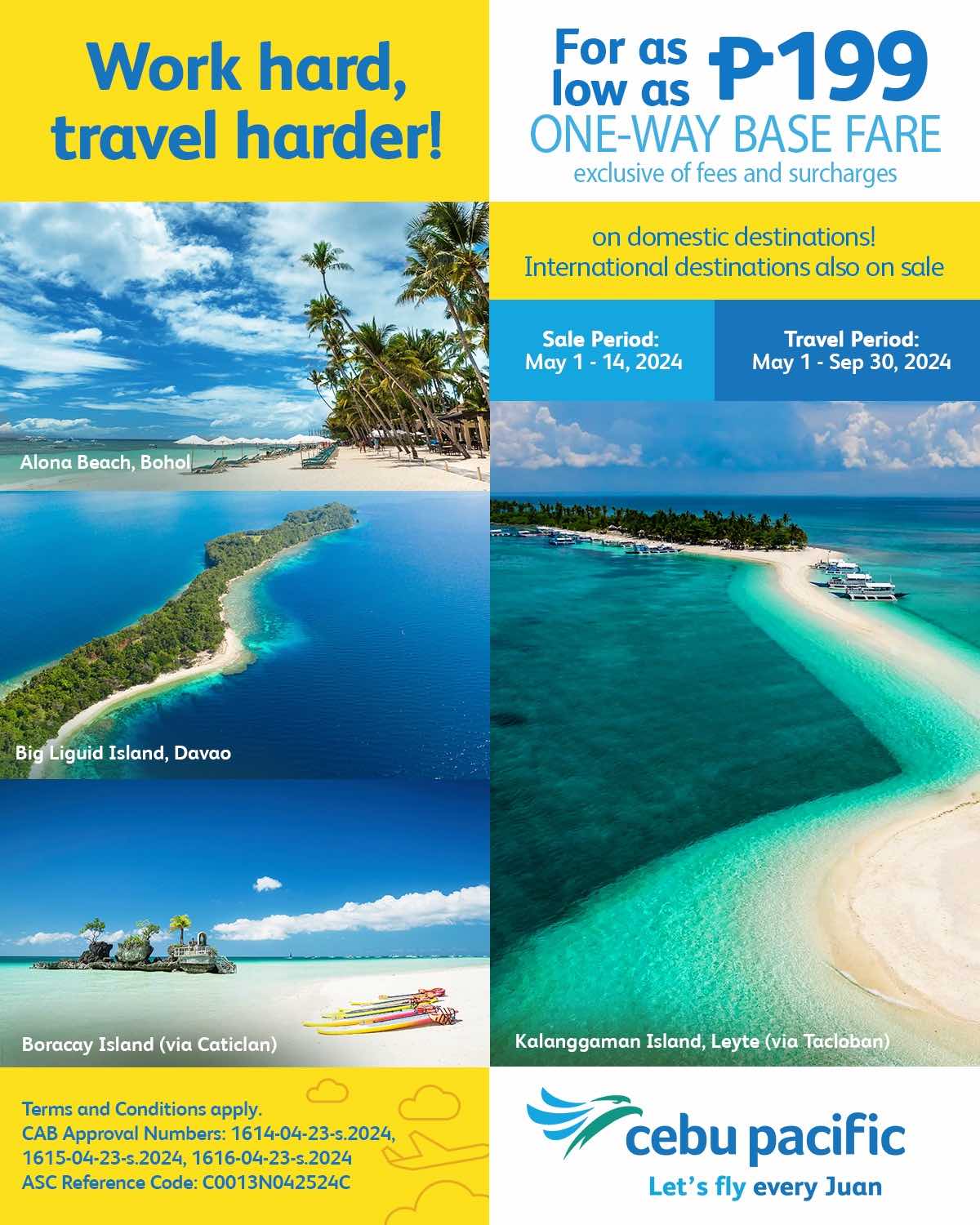 With a booking period until May 14, the seat sale lets you fly to domestic spots like Boracay, Puerto Princesa, Roxas, and more as well as international destinations such as Brunei and Hong Kong starting at less than P200.