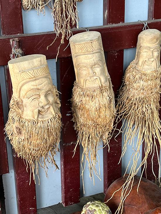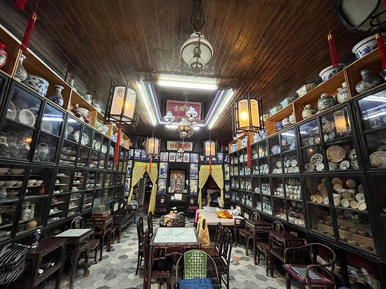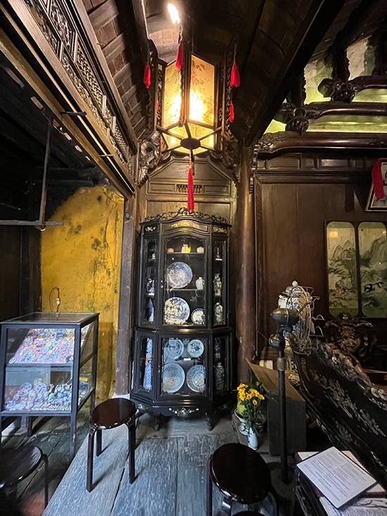 Down the road from Tan Ky, we were attracted to a house with a bright turquoise façade and display cabinets of Ming porcelain, which we thought were for sale. It turned out to be the Diep Dong house built in the 19th century for the Chinese merchant from whom it got its name. Once a dispensary for Chinese medicine, the ground floor has glass-enclosed apothecary cases for objects while the owner’s collection of antiques is upstairs.