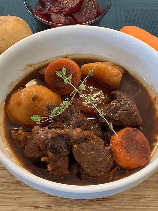 This is traditionally accompanied with pickled purple cabbage. The acidity of the pickled cabbage balances the richness of the stew. If not available, you may substitute pickled sugar beets (see below for recipe). Or you can serve it with achara.