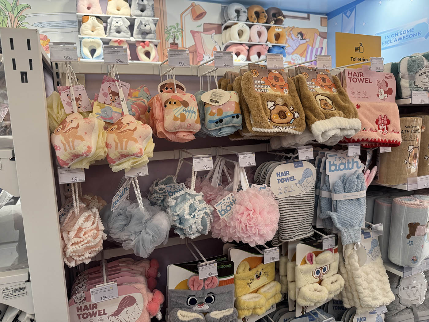As you make your way to the back of the store, discover a curated selection of household and travel must-haves. This section features ergonomic neck pillows, kitchen essentials, and complete travel kits and toiletries.