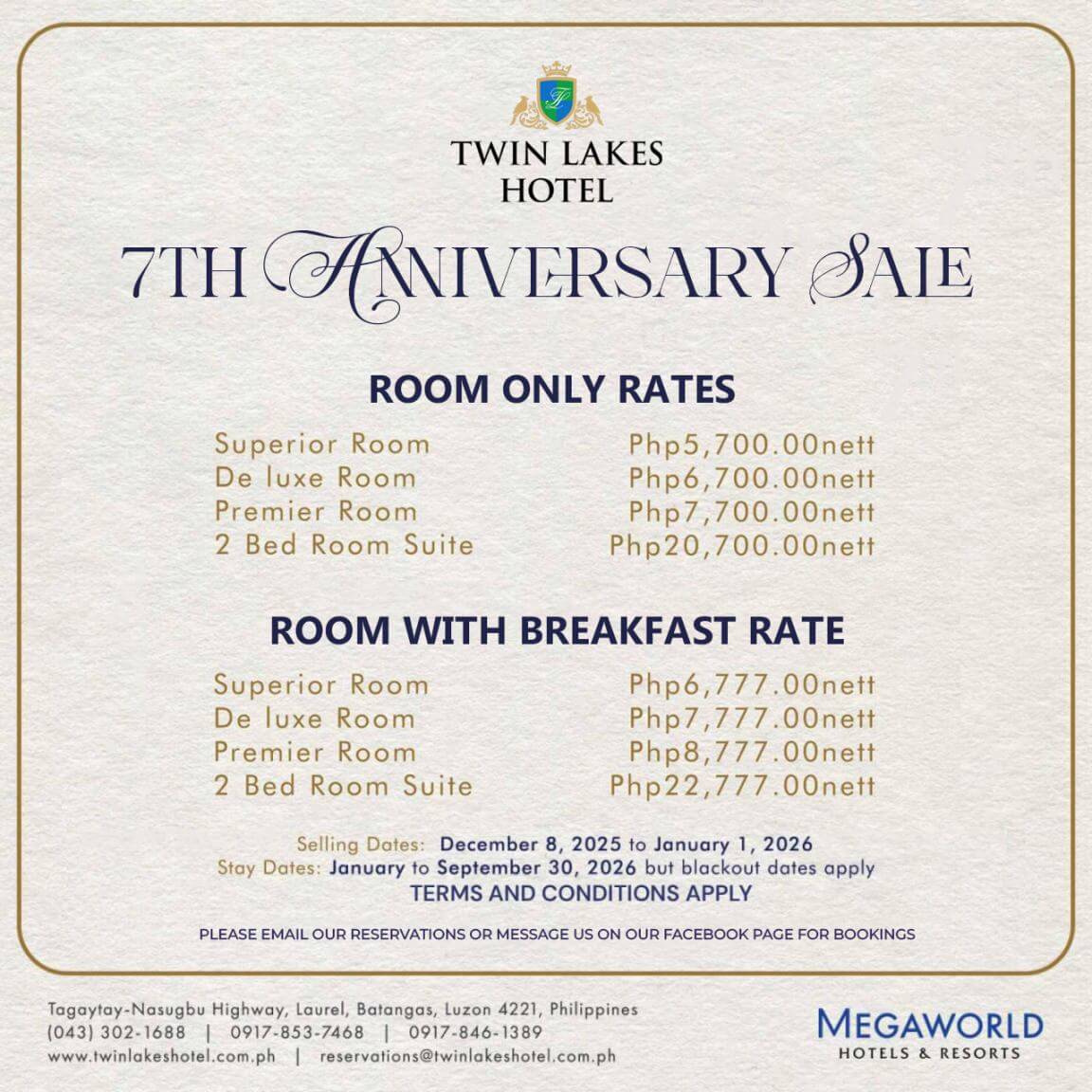 Dreaming of a much-needed escape to Tagaytay? Now’s the perfect time to make it happen as Twin Lakes Hotel is celebrating its seventh anniversary this December with an exciting sale.
