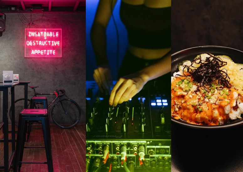 Tetsuo's dimly lit interiors, neon light sign, and vibe with a skateboard on the wall, and at one branch, a DJ booth, is made for low-key solo dining sessions.