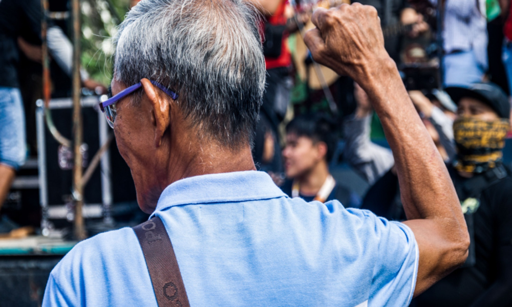 An elderly man with a raised fist in a protest during the 34th anniversary of the EDSA People Power Revolution on Feb. 2020 at Mendiola.