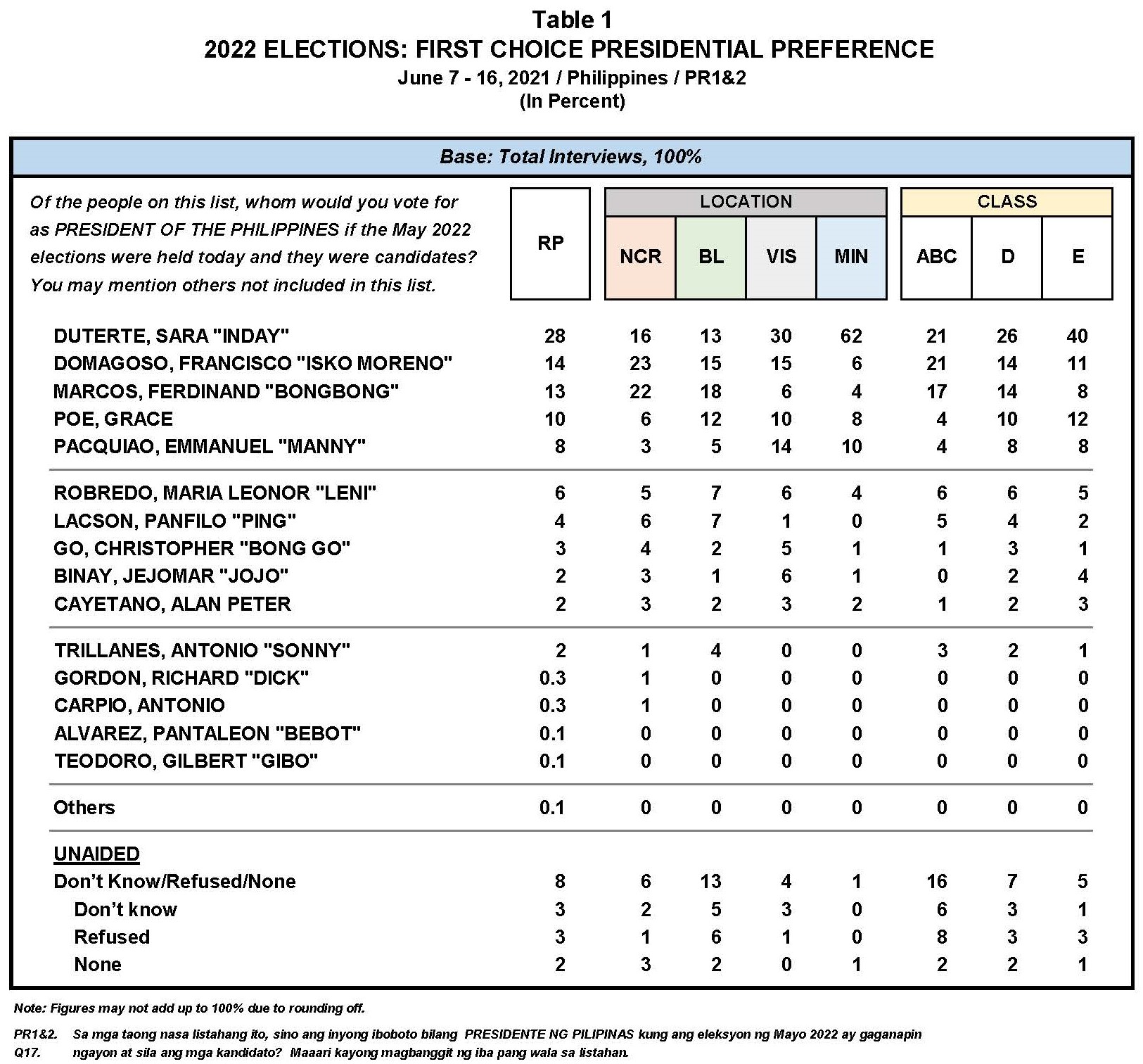 For the first-choice presidential preferences, Sara Duterte leads the pack with Manila Mayor Francisco "Isko" Moreno (14%) following close behind. Part of the Top 5 preferences are Ferdinand "Bongbong" Marcos (13%), Sen. Grace Poe (10%), and Sen. Manny Pacquiao (8%).
