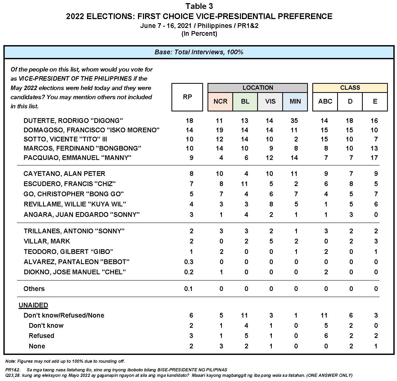 Meanwhile, President Duterte claimed the top spot for the first choice as Vice President ahead of Isko Moreno (14%), Vicente "Tito" Sotto III (10%), Bongbong Marcos (10%), and Manny Pacquiao (9%).