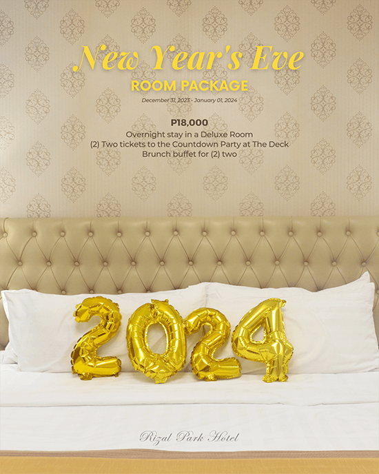 As the year transitions, Rizal Park Hotel presents the New Year’s Eve Room Package, from Dec. 31 to Jan. 1, 2024. The package includes an overnight stay in a Deluxe Room, two tickets to the New Year’s Eve Countdown Party at The Deck, and a New Year’s Brunch buffet for two, priced at P18,000.