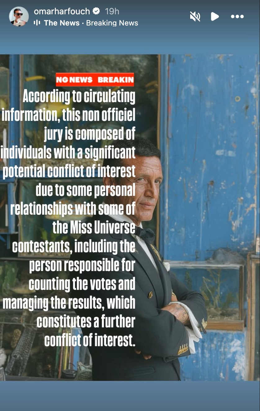 "This non-official jury is composed of individuals with a significant potential conflict of interest due to some personal relationships with some of the Miss Universe contestants, including the person responsible for counting the votes and managing the results, which constitutes a further conflict of interest," Harfouch claimed.