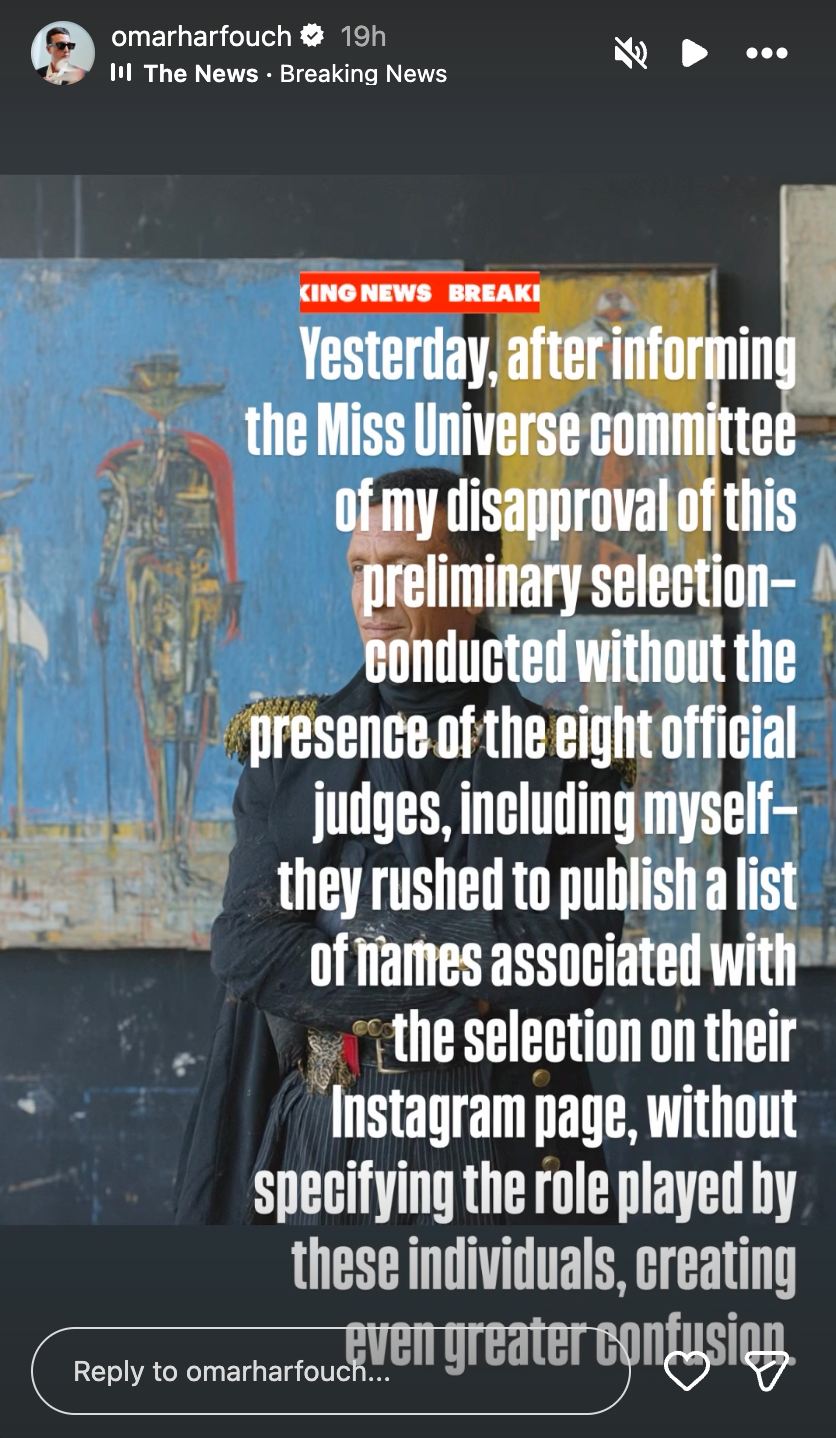 The organization has now acknowledged Harfouch's resignation and has prohibited him from using, displaying, referencing, or associating himself with any Miss Universe trademarks, service marks, logos, titles, or registered properties in any format.