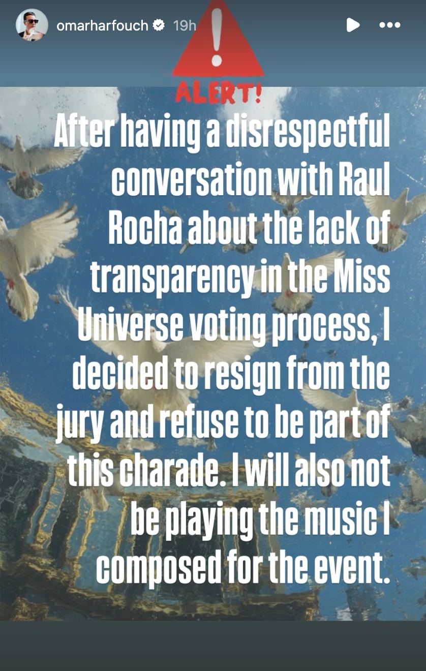 Following a "disrespectful conversation" with Miss Universe President Raúl Rocha, he decided to resign from the jury as he "refuses to be part of this charade."