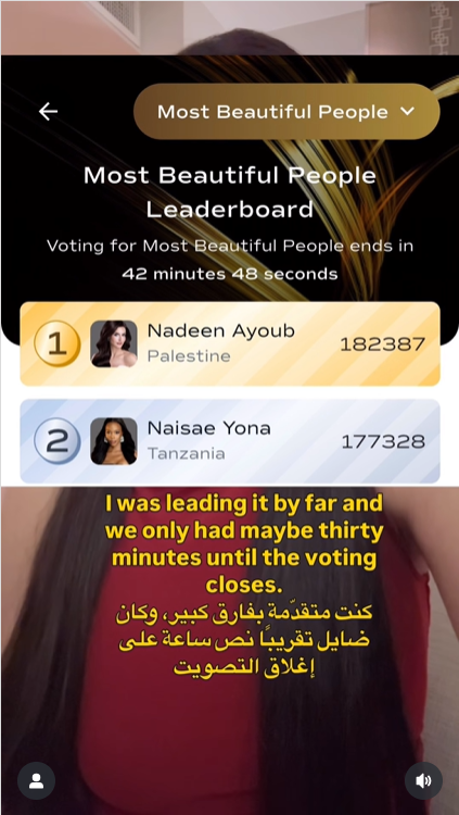 Ayoub then noted how Miss Tanzania suddenly got a surge of 16,010 votes within two minutes, taking over the top spot with 193,338 votes. Miss Palestine claimed that this is "very impossible to do unless there's more than one person voting."